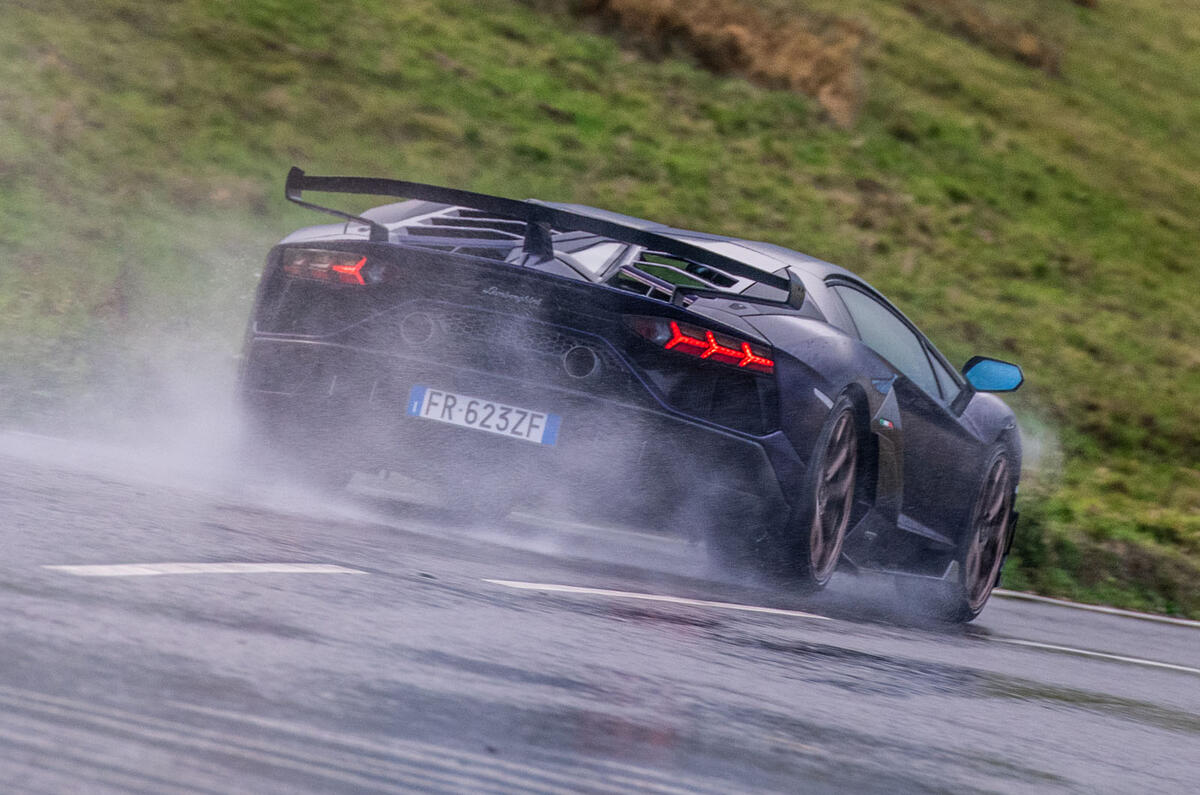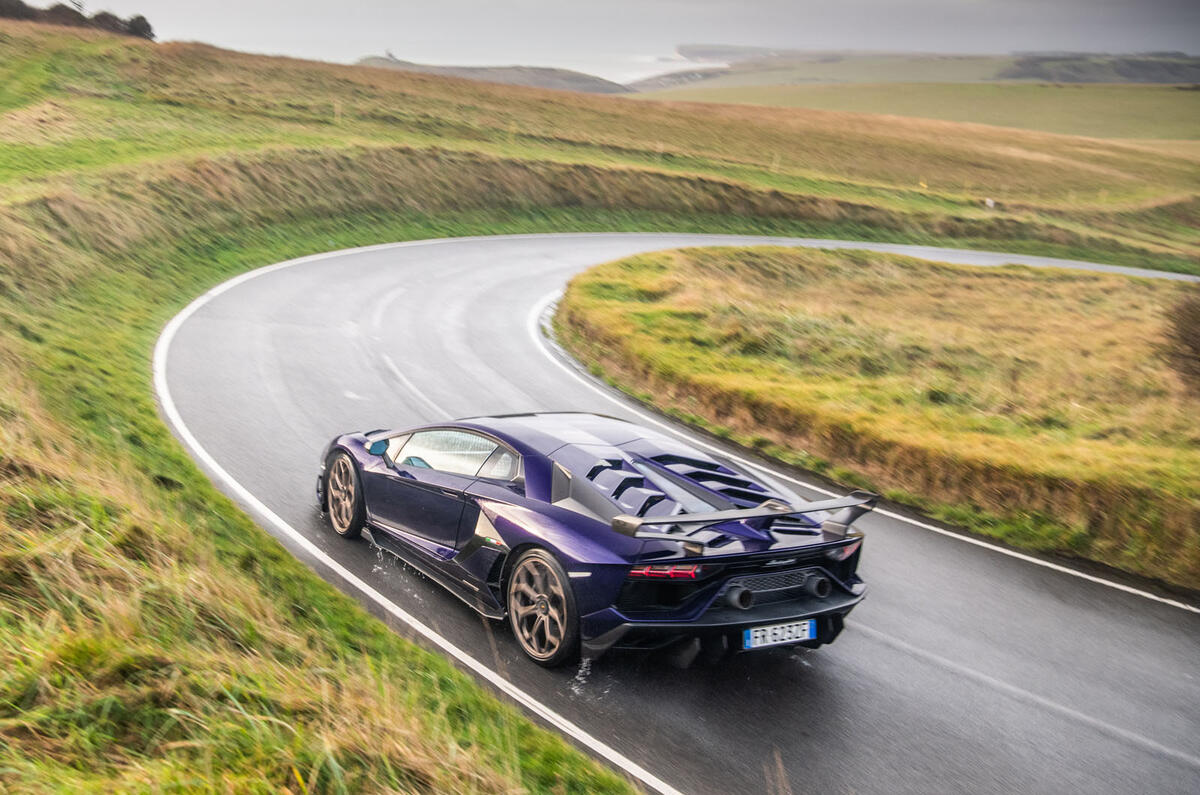 The sheer size, weight and inertia of the bigger car are the primary reasons for that. Heavier and harder on its tyres than most mid-engined supercars, the SVJ still develops masses of lateral grip and good throttle-on balance to begin with on sticky Trofeo R rubber – though it ebbs towards understeer as that grip level degrades.